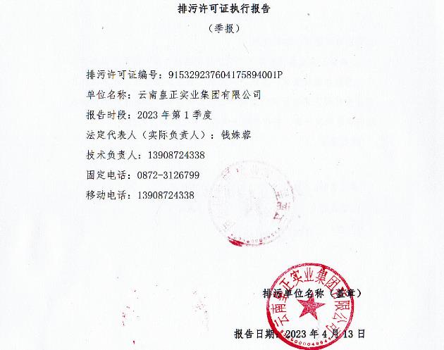 2022年云南皇正實業集團有限公司排污許可證季報 - 第一季度 2022年云南皇正實業集團有限公司排污許可證季報-第一季度