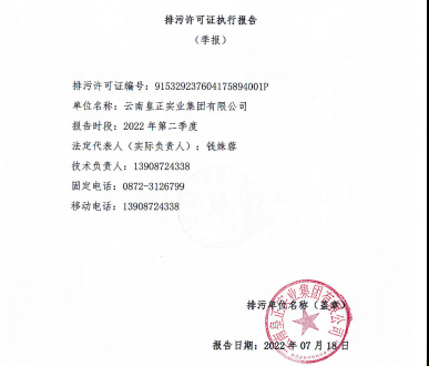 2022年云南皇正實業集團有限公司排污許可證季報 - 第二季度 排污許可證季報-第二季度
