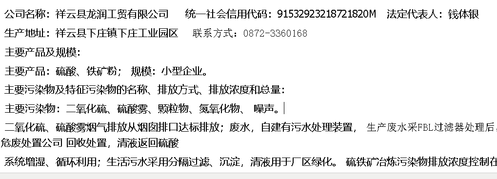 祥云縣龍潤工貿有限公司環保管理信息公開 公司名稱:祥云縣龍潤工貿有限公司統一社會信用代碼:91532923218721820M法定代表人:錢體銀生產地址:祥云縣下莊鎮下莊工業園區聯...